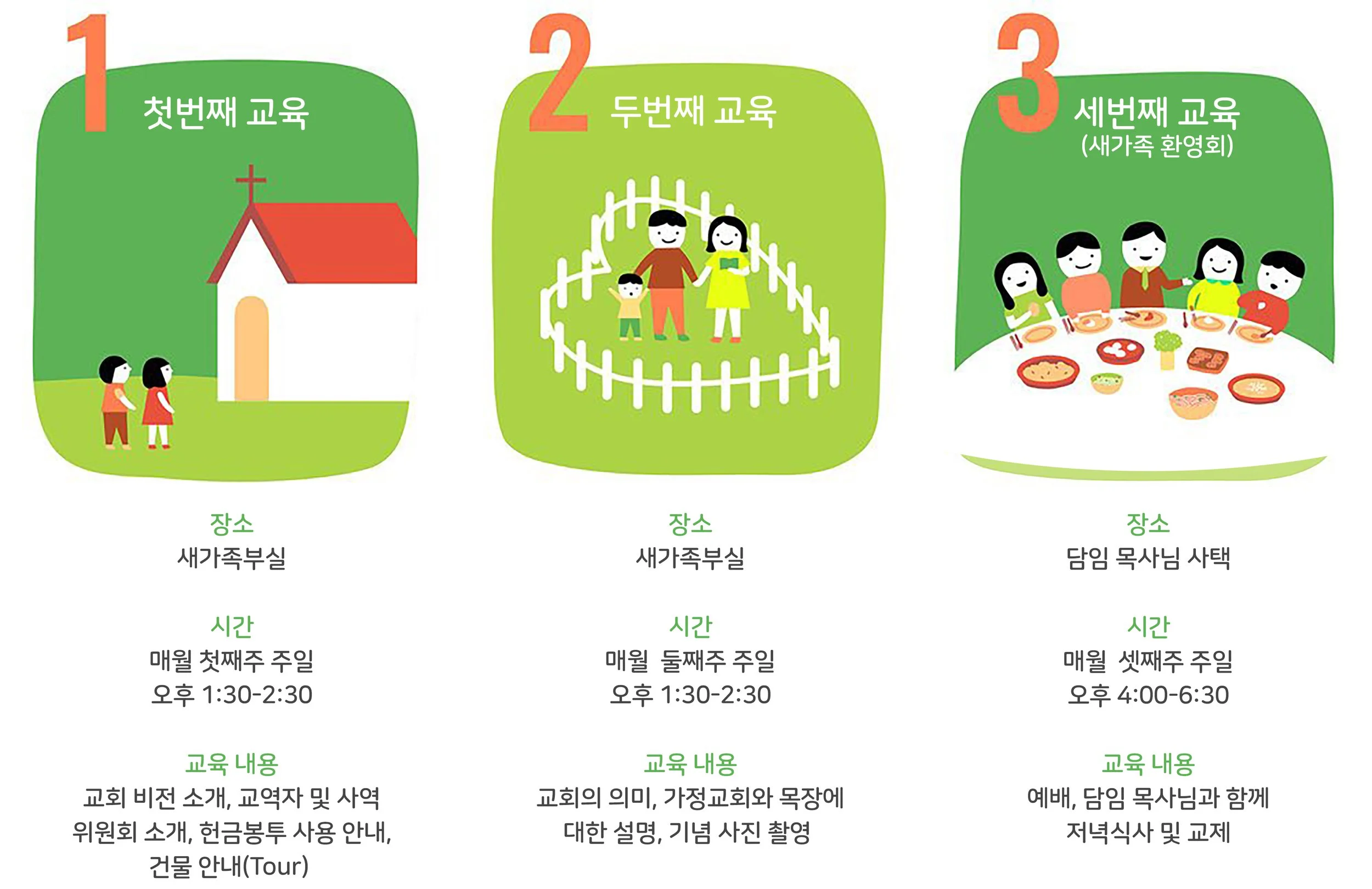 일반적으로 새가족 안내데스크에 오시면 방문자 카드를 작성하신 후 교회 소개를 위한 새가족 교육을 안내해 드립니다. 저희 교회의 새가족교육은 매월 첫 주일과 둘째 주일 오후 2:00에 진행되는 교회 소개와 세째 주일 오후 4시에 교회 친교실에서 식사와 함께 하는 환영회로 3주간에 걸쳐 진행됩니다.